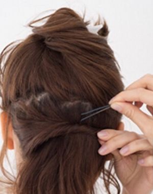Step2:下面剩余的头发聚集在一起,向左侧拉,扭转后固定在左侧发丝的上方。