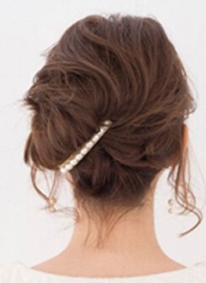 Step5:最后用一个条形发卡点缀在发髻的缝隙位置,这样这款圆脸女生短烫发盘发才完美好看呢。