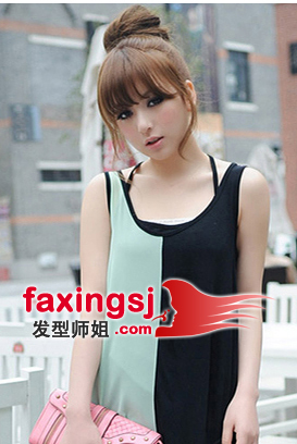 同样是齐刘海,却有着微显浓厚和平滑的感觉,梳在额头上的顺滑发丝大方不失秀气,自然的梳发也添着分外靓丽的精致和秀气。