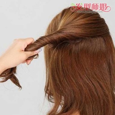 侧方向,将手中的头发拉直,扭转。