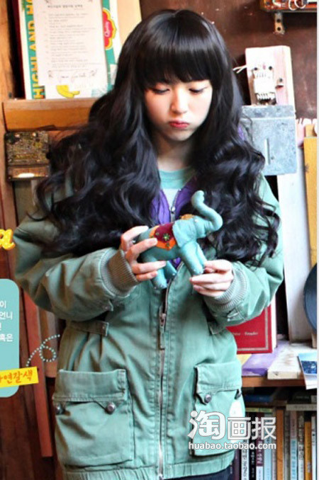 齐刘海+大波浪打造可爱活力美少女Look!和冬日韩国MM经常穿搭的卫衣配合度相当高!略长的刘海还可以考虑扎成一个小小的丸子哦。