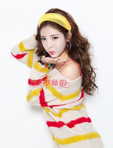 在韩版女生的发型设计中,不仅是大卷或者小卷的发卷区别,借用发带来完成的发型也有很多的花样呢。蓬松长卷发发型,发量多一点的女生,从发根开始烫发,发带向后固定的时候,尽量调整好发根的方向。
