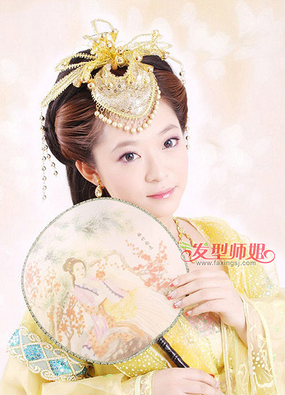 完美精致的鹅蛋脸在发型的衬托下更显美艳动人!额前的刘海中分,将全部的发丝在脑后盘起,长长的秀发披在肩后,额前佩戴上珍珠发饰,公主范十足!
