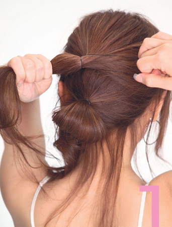 先把头发梳理整齐,然后分成上、下两区,我们需要先绑两个小发髻,就是在即将绑成马尾状时不要将发尾拉出,呈现一个立体球状的中空发髻就可以了