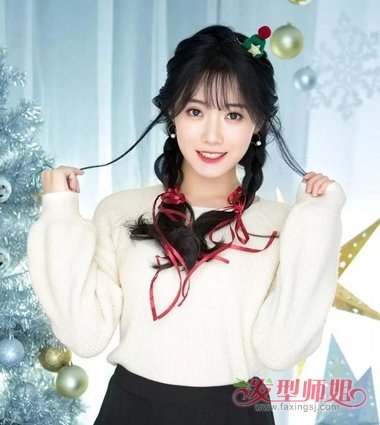 黑色的头发制作双编发发型,将额头上的刘海梳成碎发的曲线,双编发发型两边交叠着编起来,编成了三股麻花辫之后,用了红色的丝带固定整个辫子,虽然是低扎的辫子发型,但发根头发还是很蓬松的。