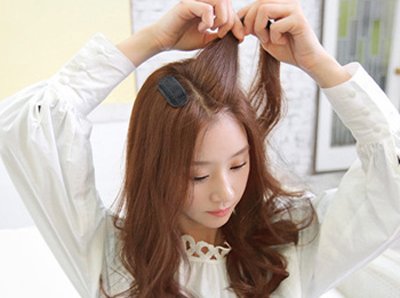 第四步:发垫固定好之后,将之前散落在左侧边的头发重新拉到头顶右边。