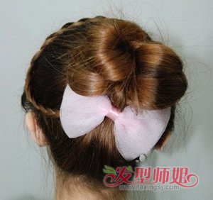 第七步:将之前的蝎子辫发我向后拉至花苞头发髻的低下,用发卡固定住,卡上淡粉色的蝴蝶结发卡,这款韩式甜美优雅的编发花苞头