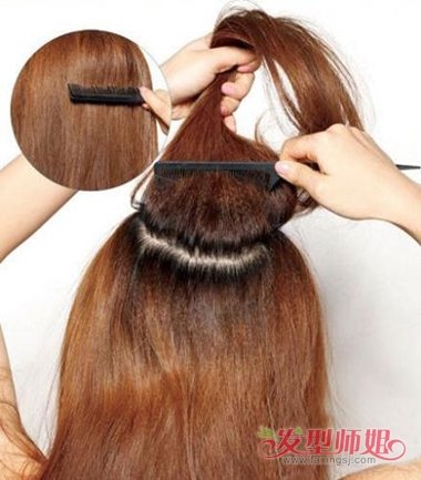 逆梳打毛用的是密齿梳,将发顶的头发简单做出蓬松之后,发丝散下来,用梳子尖端将头发抿的服帖。