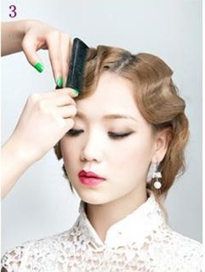 第三步:额前的发丝采用四六分的造型,利用发梳也发胶将左侧的发丝做复古的波纹造型,依次往下处理发丝。