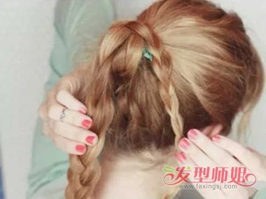 拉住其中一个辫子,另一条辫子缠绕在发根上。