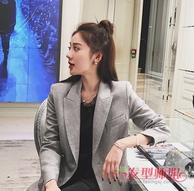 职场女士也能梳半丸子头发型,将一头厚厚的直发半扎成露额丸子头,与灰色西服套装搭配在一起,做俏皮有活力的职场丽人,发型减龄,服装显气质,哎呦,你的职场造型很不错呢。