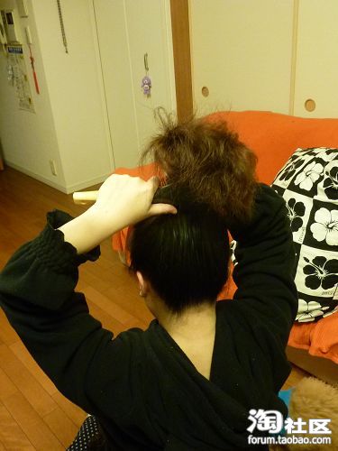 先把头发扎高一些,尽量把头低下去,把腰弯下去。这样头发部分在头顶的中央部分了*