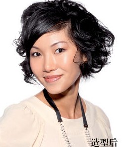 处理:利用自身皮肤及面容特征,在短发上作卷烫处理,给人黑人美女的感觉。相较于气质与容貌,发质给人过分硬涩,所以用特殊美发产品软化头发。发型完成后要时不时地去抓一抓头顶的头发让其保持蓬松感,额头也会显得宽一些,看着更美。
