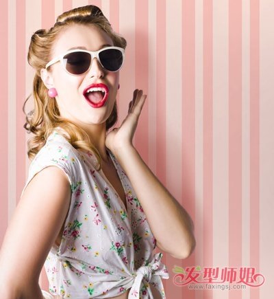 黄色的中长发做成偏分的造型,两侧的发丝向中间部分做蓬松感的扭转,刘海发丝向后梳理成蓬松感的线条,下层梳理下来的中长发做螺旋烫发处理,有了墨镜的搭配愈发有摩登女郎范。