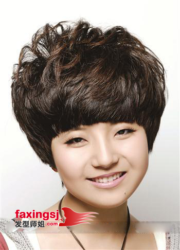 齐刘海的国字脸蓬松短卷发发型,梳在额头上的优雅的发丝精致不失秀气,梳在发顶的优雅的柔和刘海,自然更添顺滑效果的丝滑梳发,蓬松的梳发弧度也添着很是浓郁的自然味道,柔和的梳发也添着大方的感觉,对国字脸的典雅修饰很浓。