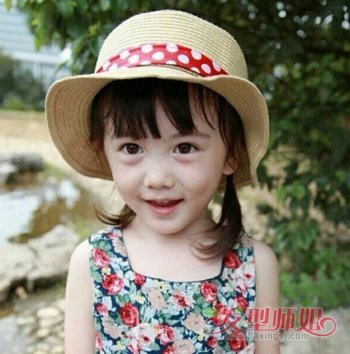 可爱漂亮的小女孩梳着齐刘海妹妹头短发,夏天带女儿出去玩的时候,妈妈可以将小女孩的短发扎成双马尾辫,垂在肩上,戴上一顶遮阳帽,穿上碎花裙,女孩萌萌哒的形象太讨人喜欢了。
