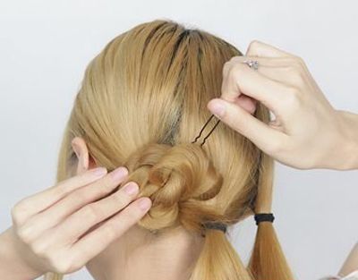 第三步:将编织好的麻花辫盘成简单的丸子发髻。