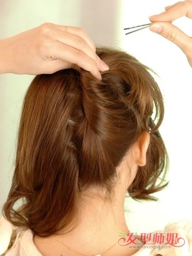 第二步:接着上部的继续操作,前面的头发别好之后,后面的头发是向上缠绕了起来,最后是一只手紧紧的按住了缠绕好的头发,然后是开始了下步的操作了。