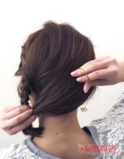 步骤三:将左前方编织好的发辫与剩余的散发一起扎起来。