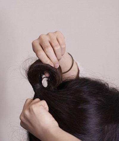 第五步:将马尾辫上半部分从上边的小洞内穿过。