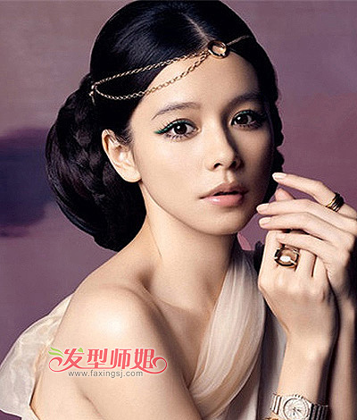 小编点评:这款方脸的盘发是不是很有气质感和古典的味道呢?中分的编盘发很好的映衬出脸型呢,而自然的黑色秀发更具高雅感呢,额前搭配上发饰,很有异域的风情呢。