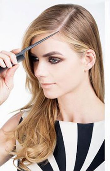 第一步:饱满丰盈的微卷发梳理平整后,采用三七分的造型设计。