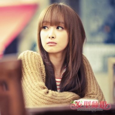 大圆脸女生丰盈中长发拉直之后,服帖而灵动,轻薄直刘海将眼睛上方位置全部遮掩,这样女生的大圆脸就变成了小圆脸了哟,可爱甜美,将中长至染成深栗色,女生原本有点暗的皮肤看起来光滑又白皙。