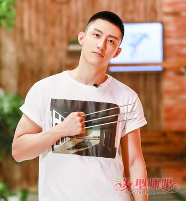 侧边头发直接剃掉,头顶短发剃成圆寸造型,个性时尚的露额超短圆寸发型搭配简单白T恤,正在模仿钢铁侠的黄景瑜演绎着小鲜肉潮男的魅力与风采,阳光活力,而又不失力量美。